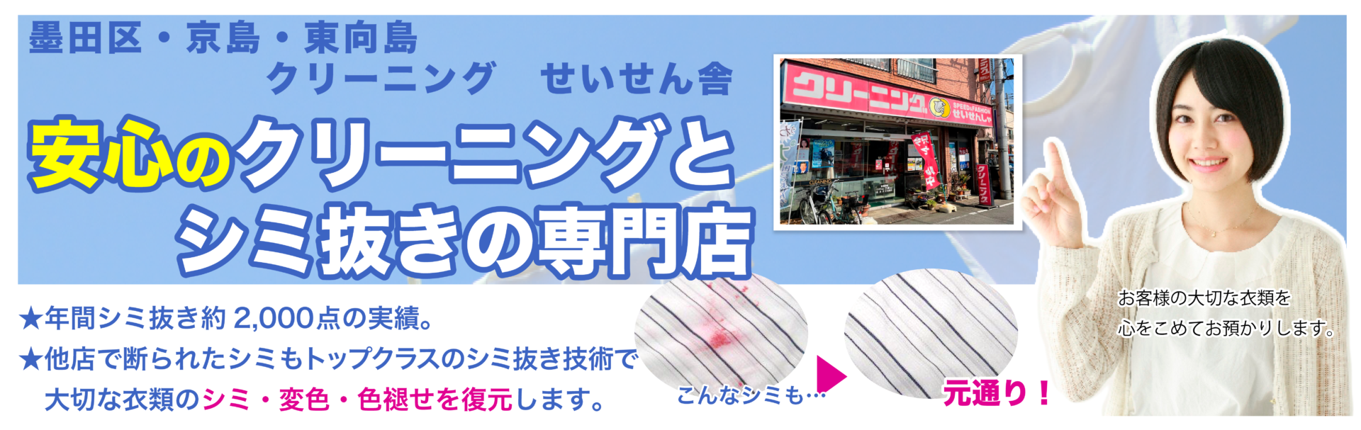 付いたばかりの付着物は「よごれ」、その汚れが繊維に染みこんでしまうと「シミ」、染みが数日経つと「変色・脱色」と変化していきます。繊維に染み込んだ汚れを薬品で溶かしたりして取り除くのは【シミ抜き】ですが、変色・脱色を直すためには【復元加工】と言って漂白や染色などの特殊な加工が必要になるところが違います。
